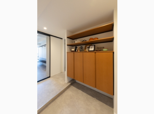 コンパクトになりがちな玄関はひと続きの空間へと再構成し、ひとつの家具のように風景の中に溶け込む設えへと見直しました。