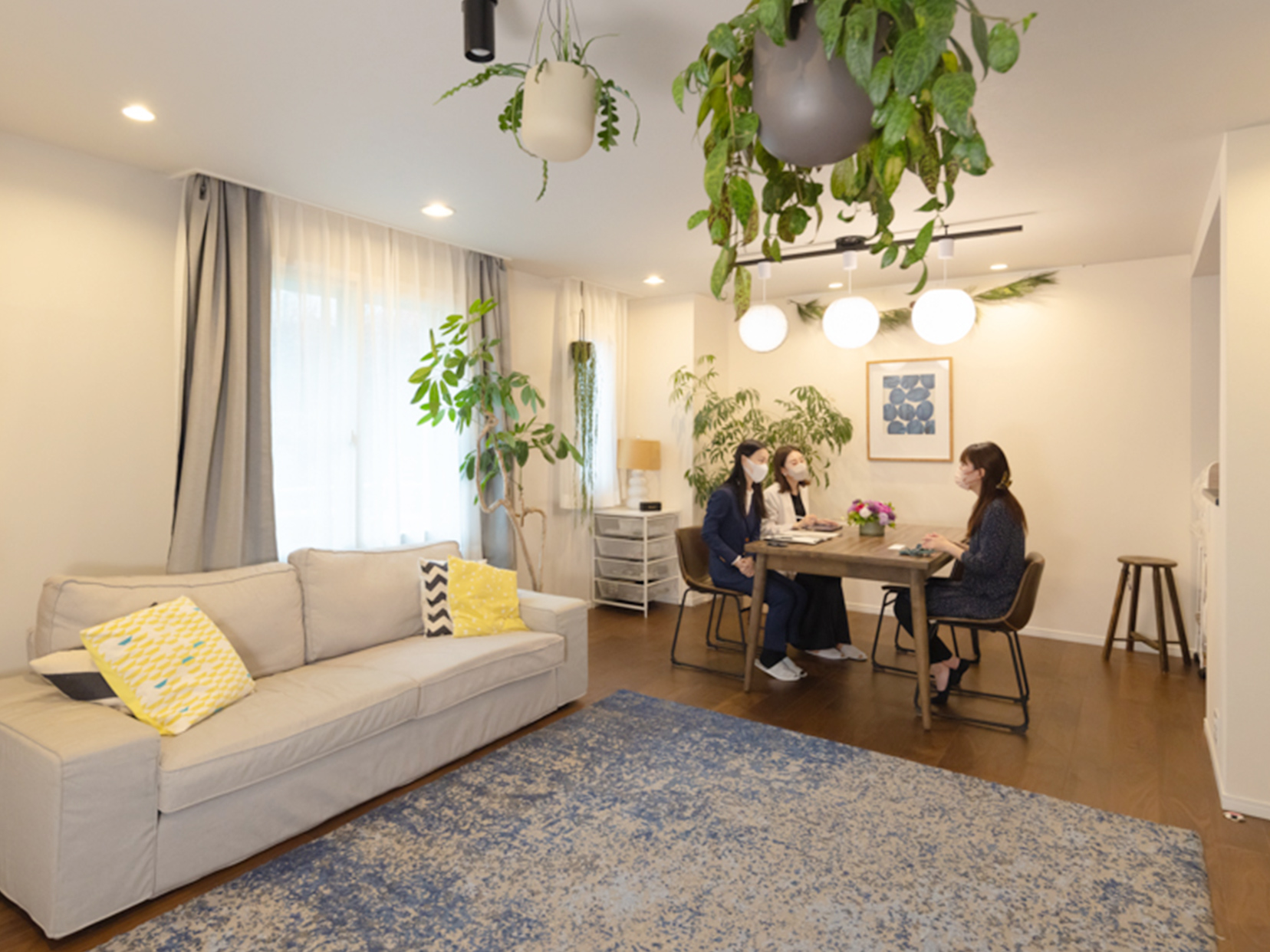 天井が高いのでリースなどを吊るすと、お部屋にとても映えて心地良いです。前の住まいで飾っていたお気に入りのお花もプラスして、植物中心のインテリアを楽しんでいます。