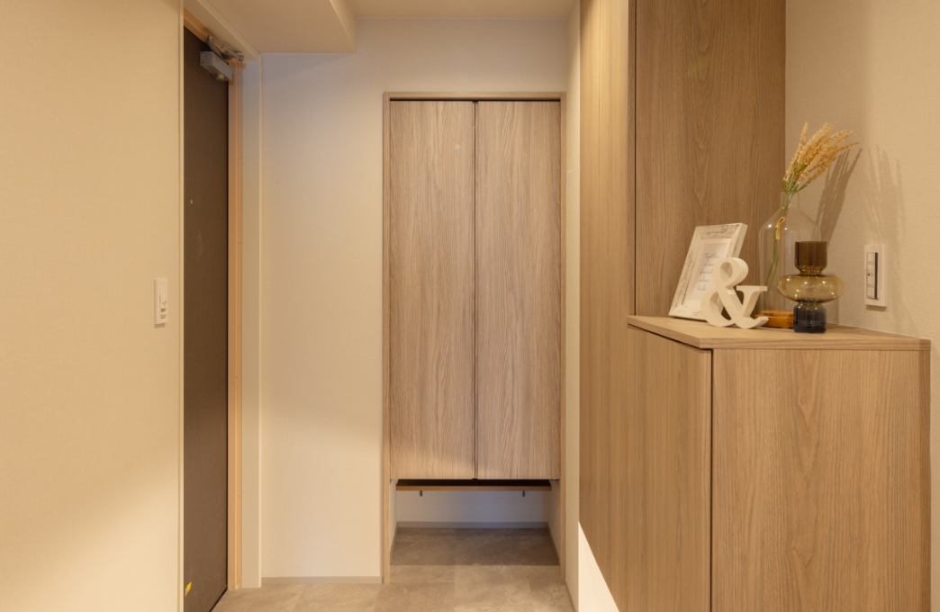 例えば寝室のデッドスペースを玄関側に用いて廊下幅を拡大。帰宅した際に、ゆとりを感じてホッとできる場所に仕上げます。収納横のスペースはコート掛け置き場などに活用することも。