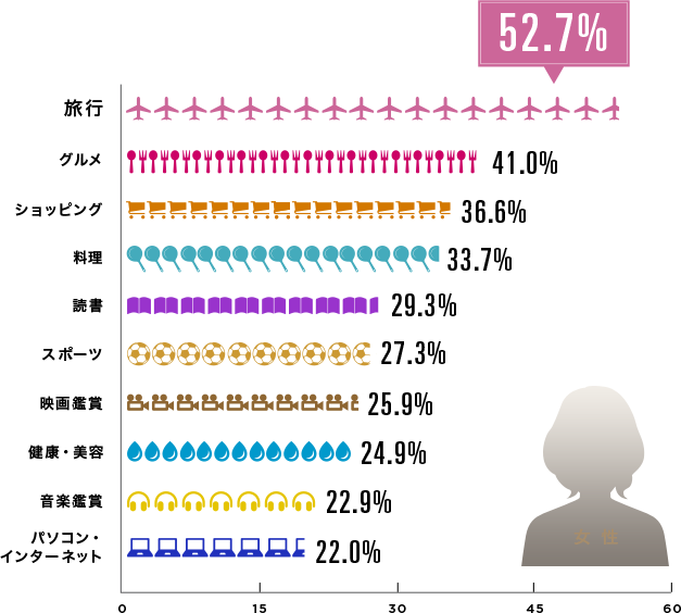 「旅行」という回答が男女ともに最も多く、約半数の方が選択されました。上記グラフ以外の詳細情報を各年代ごとで男女別に見てみると、男性では30代で1位だった「スポーツ」が年代が上がるにつれ徐々に下がり、40代以上では「音楽鑑賞」や「読書」が上位になってきます。女性では20代までが「料理」が上位だったのに代わり、30代以降「グルメ」が上位になっています。また、30代での1位は「ショッピング」で、各年代を通して「ショッピング」が1位になったのは30代のみでした。