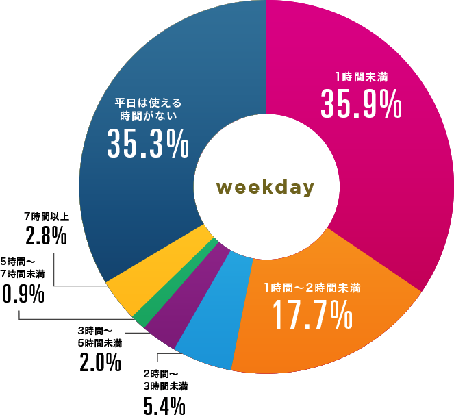 「平日に使える時間がない」方(35.3%)と「1時間未満」の方(35.9%)でおよそ7割以上(71.3%)を占めており、生活に必要な「料理」や「健康・美容」、短時間で楽しめる「読書」「音楽鑑賞」などは平日の隙間時間を使って楽しんでいるようです。