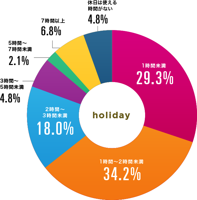 平日に比べ使える時間が増え、1時間〜3時間を趣味に費やす方が多く見受けられます。また、休日を使って7時間以上をかけて旅行される方が多くいらっしゃるようです。