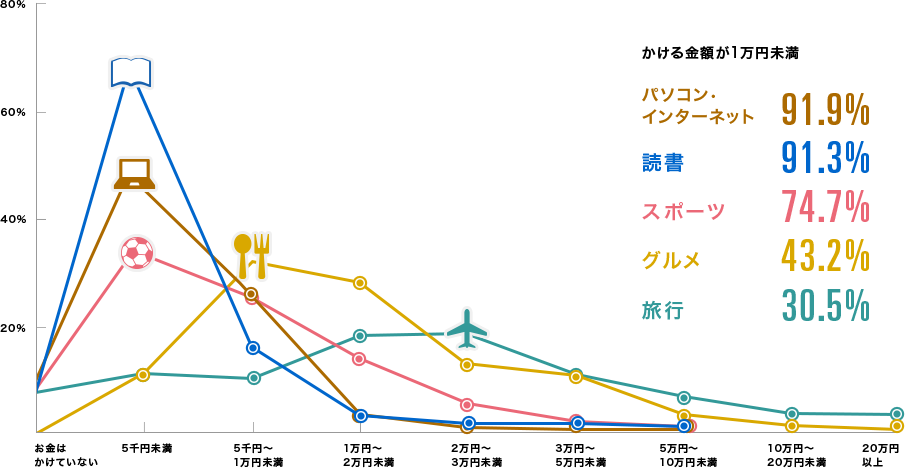 趣味にかけるお金は多くて1万円未満の方が多いようです。男女ともに人気の「旅行」だけは、月に2〜3万円未満と他の趣味と比べ高い傾向にあります。「グルメ」についても5千円〜2万円と他の趣味に比べて高い傾向が出ており、中には月に20万円以上を「グルメ」に使用している方も見られました。