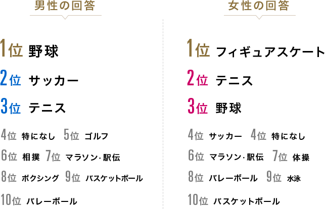 男性は1位「野球」2位「サッカー」3位「テニス」の順、女性は1位「フィギュア」2位「テニス」3位「野球」の人気順となっています。日本のテニス人気は世界に比べると低いと言われますが、観戦は男女共に上位に入っています。その他では、「ラグビー」「卓球」「バドミントン」など、オリンピック等で日本人が活躍したスポーツも挙げられています。