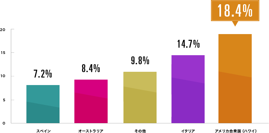 「ハワイ」が特に多かった年代は30代で、一番少なかった年代は60代でした。「イタリア」が特に多かった年代は20代で、一番少なかった年代は30代でした。その他、40代以上からその他の割合が多くなっています。年代を追うごとに海外旅行先が多様化しています。