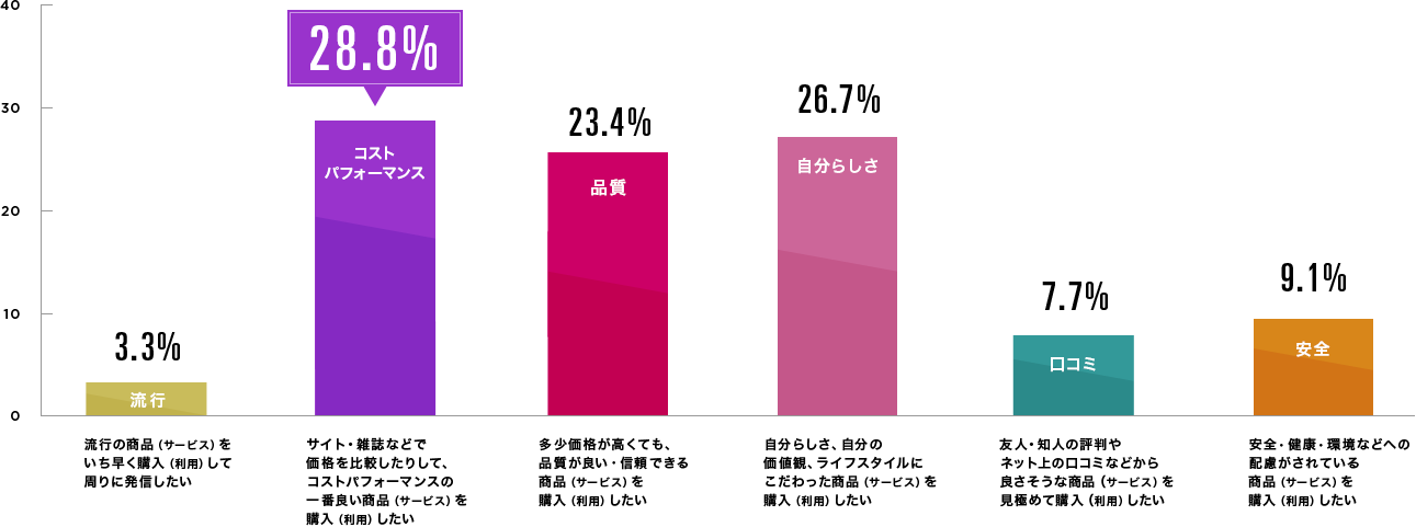 「コストパフォーマンス」を気にする方が約3割(28.8%)と最多を占めましたが、ほぼ同等の割合(26.7%)の方が「自分らしさ」を求めていることがわかります。「品質」を求める方(23.4%)よりも、自分のライフスタイルにこだわりを持つ方が多くいらっしゃいました。年代が上がるにつれ、「コストパフォーマンス」よりも「自分らしさ/ライフスタイル」にこだわる方が多くなっていく傾向にあります。