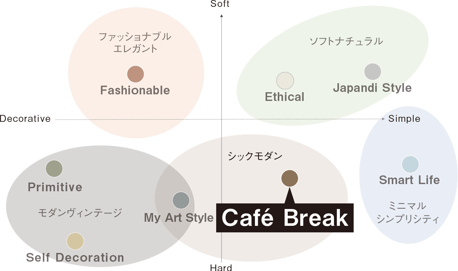 ナチュラル、トレンド感、スローライフといったキーワードから選ばれた素材の数々。軽やかなホワイトタイルと落ち着きあるホワイトとグレーのソフトな組み合わせが暮らしにメリハリをもたらせてくれます。快適で心地いい気分をあらわす「コンフィ」が素材感に表現されている。お気に入りのカフェにあるゆったりとした雰囲気に満ちた住空間が、ここに生まれます。