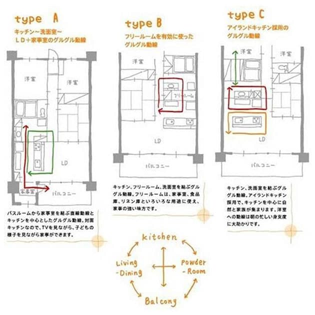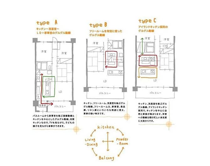 具体的には炊事、洗濯、浴室やトイレなどすべての水回りや掃除をする場所をつなぐ経路を考えます。