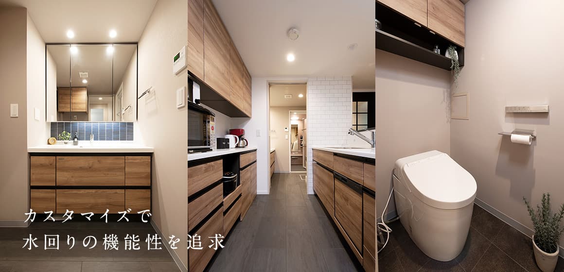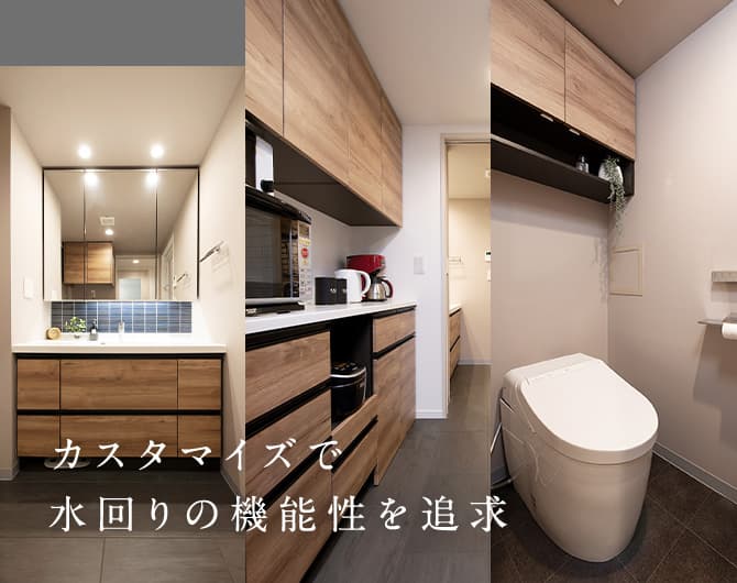 水回りですね。見せる収納でなく、機能性を重視しました。物が散らかることの多い洗面化粧台は、キレイな状態が続くように左右に小さな引き出しを4つ作り、家族がそれぞれ自分のものを置けるようにしていただきました。キッチンの食器棚は、利用予定のゴミ箱の寸法をお伝えして、キャビネットの寸法をぴったりに合わせてもらいました。コスモスイニシアオリジナルの設備は、サイズや仕様が細かくカスタマイズできて、家族が片付けしやすいので助かりますね。
