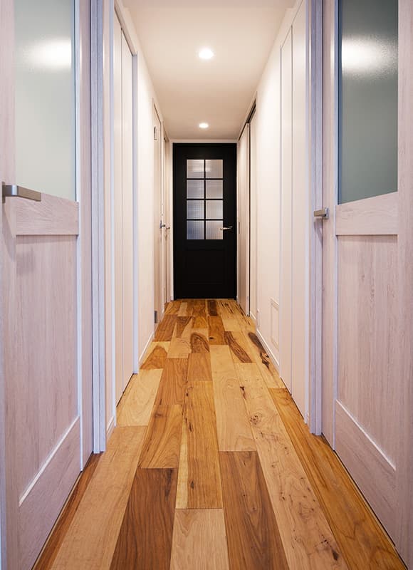 「木に包まれて暮らしたい」と思っておりました。今回無垢床にこだわった甲斐があり、裸足で歩くのがとても気持ちいいです。白と茶のコントラストがお気に入りで、経年ごとに味わいが変わっていくのも楽しみです。