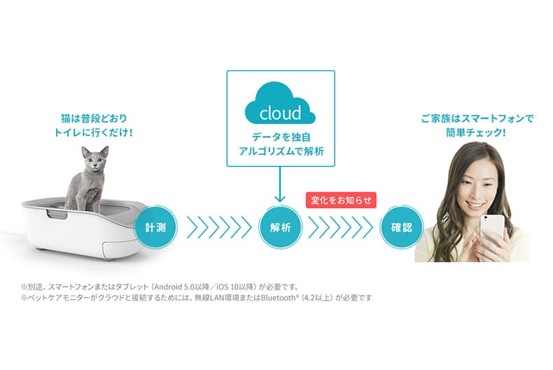 “ねこ”の体重・尿量・尿回数・滞在時間・設置場所周辺の温度を簡単に、お手持ちのスマートフォン等で確認することが可能です。(※別途、COCOROPETへの加入が必要です)合わせて、室内には遠隔操作が可能なエアコンも設置しているため、このヘルスケアシステムで“ねこ”の状態を確認し、それに合わせて室内の温度調整をすることができます。外出先からすぐに状態を確認して調整できるため、日中不在の時間も安心ですね。
