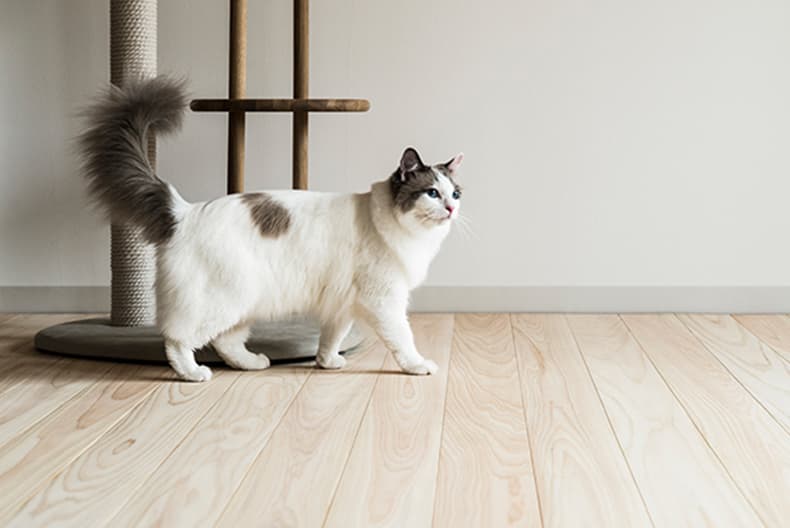 “ねこ”は毎日、高いところに上ったり下りたりをしながら日々を過ごします。そんな“ねこ”の行動性に沿って、サンワカンパニーと、RINNで共同開発されたヒノキ素材の、ねこ共生住宅用フローリング「NEKOFLOOR」を採用しました。ヒノキは調湿機能が高く、樹種特有のやわらかさがあり、適度な弾力性があるため、着地の時の衝撃を和らげることができます。また、深い浸透性と酸素透過性が高く、消臭効果が高いことも特長です。