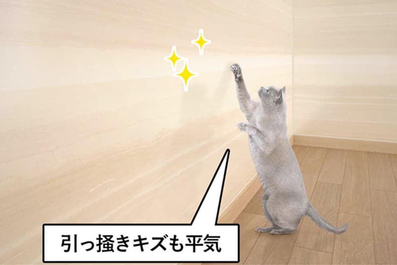 耐久性・消臭性に優れた、“ねこ”にぴったりのクロスを取り入れました。また、特殊加工により表面を強化していますので、爪によるキズにも強いクロスです。