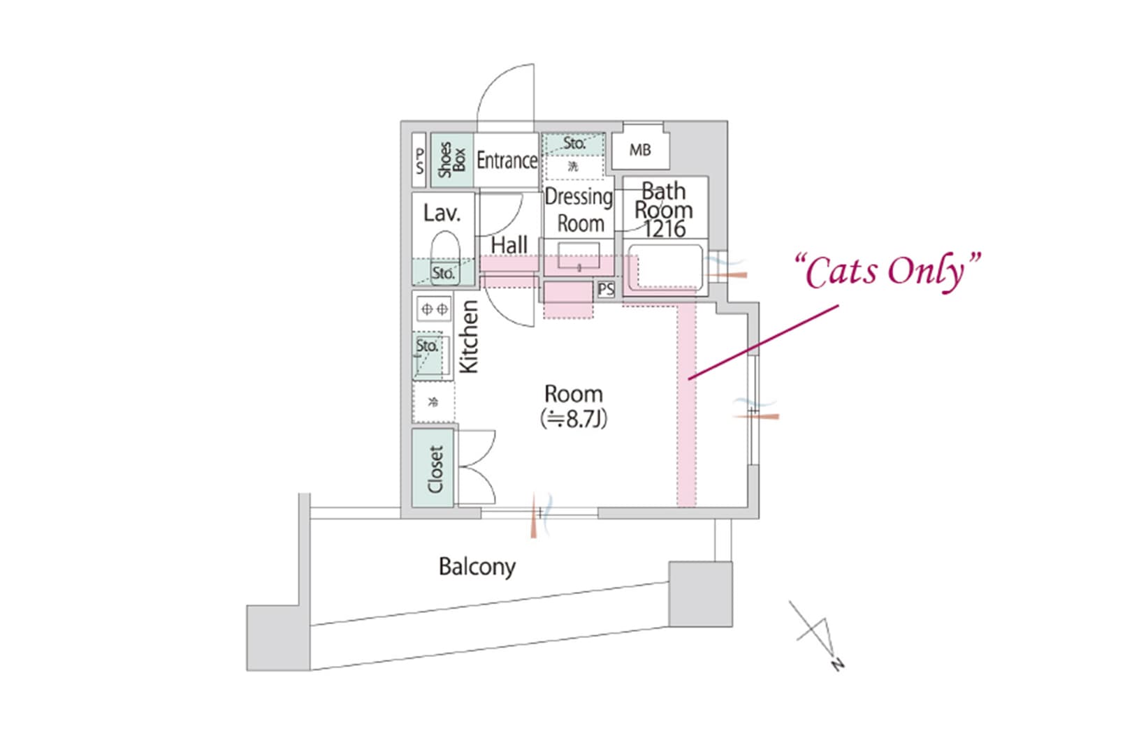 この“ねこ”専用スペースは、居室から玄関にもにつながっています。「おかえり」。「ただいま」。“ねこ”と飼い主の、毎日のあいさつが自然と生まれます。