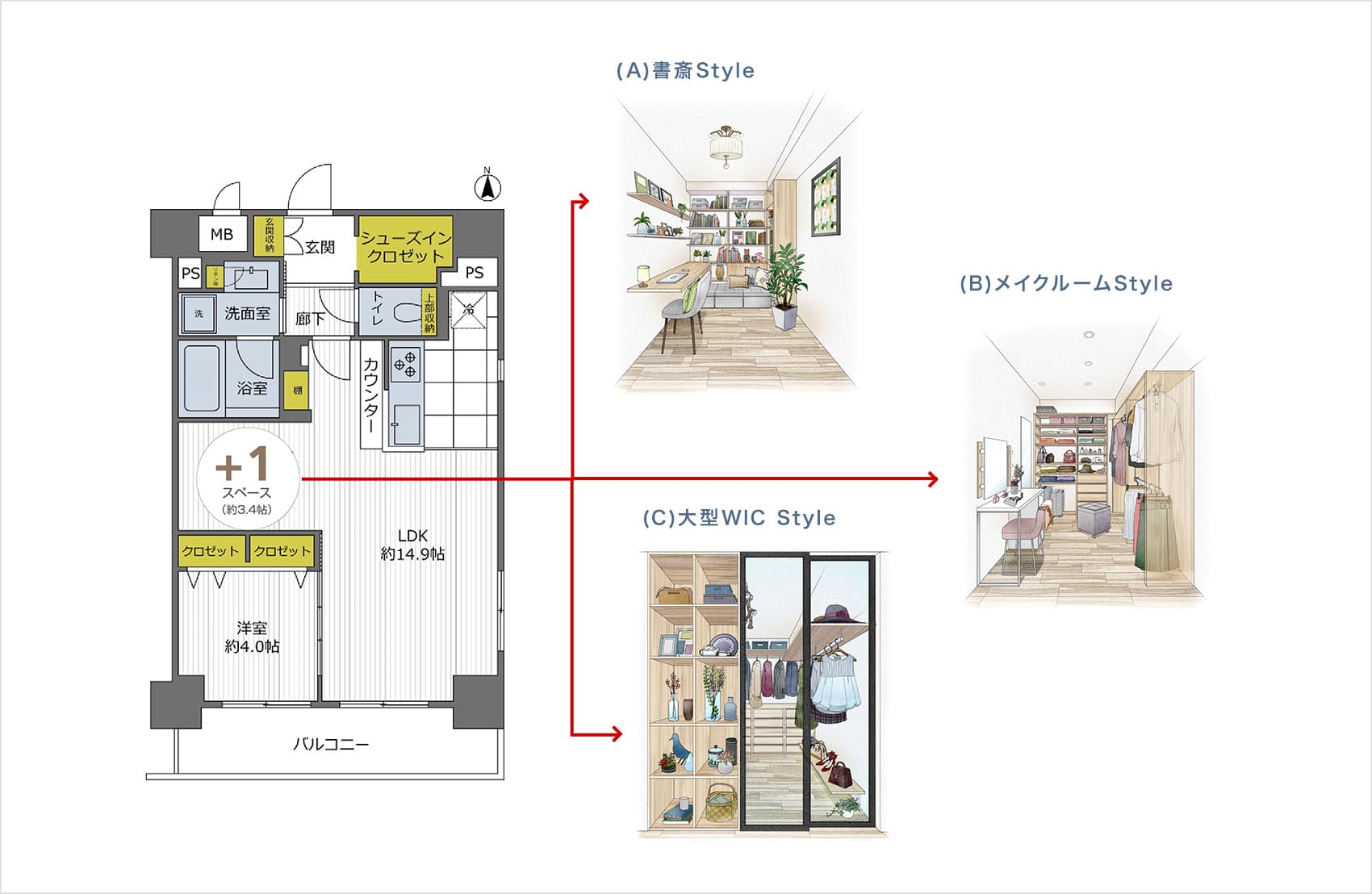 ご契約後、A)書斎、B)メイクルーム、C)⼤型WIC の中から、あなたのライフプランにそった仕上がりをセレクトいただきます。⽇々の⽣活や趣味、志向に合わせて、住まい⽅に寄り添う提案です。