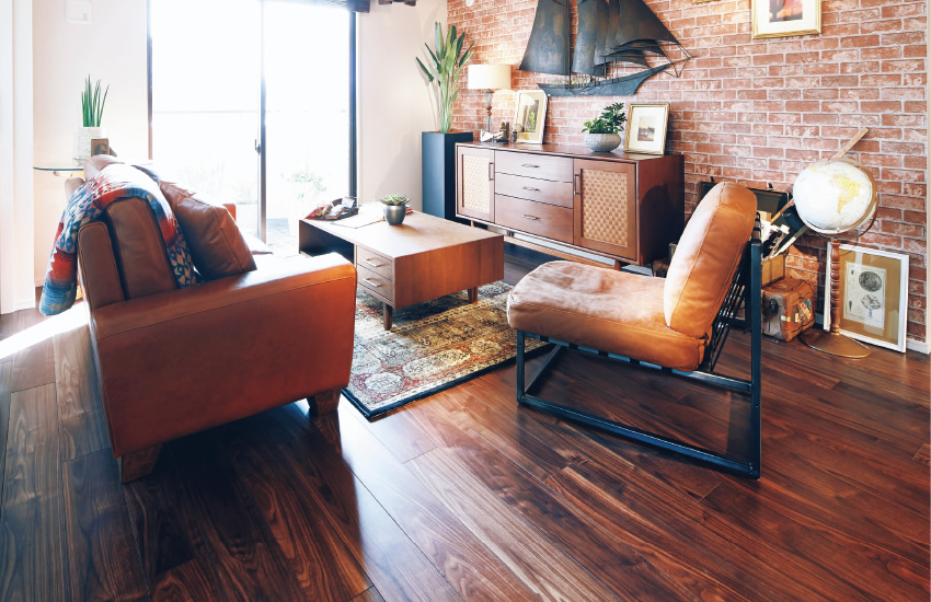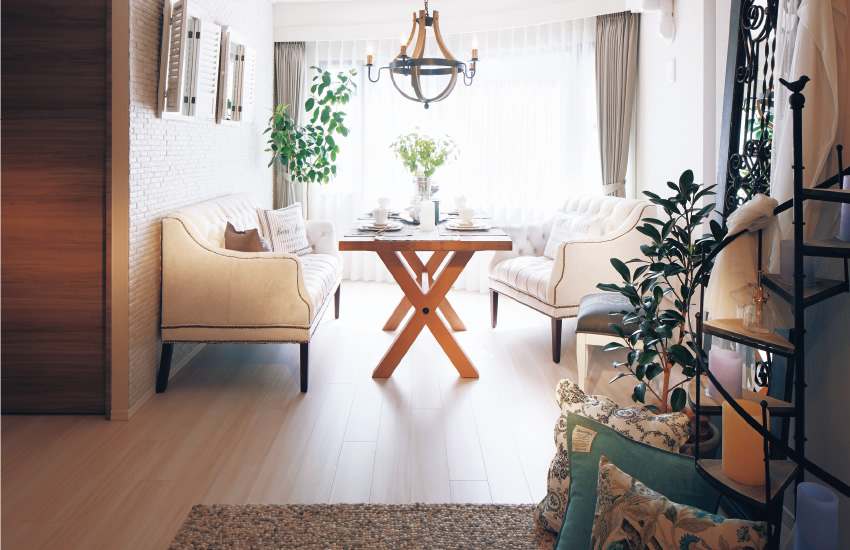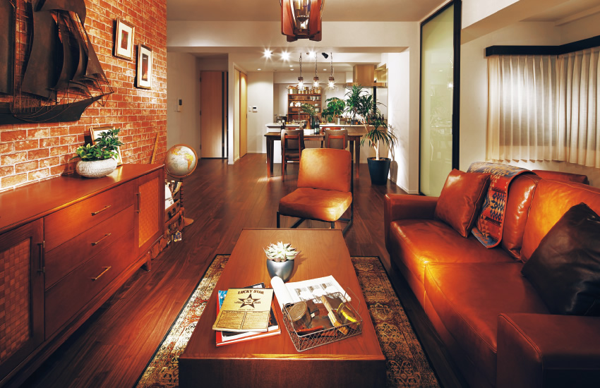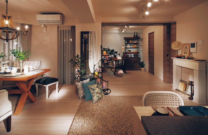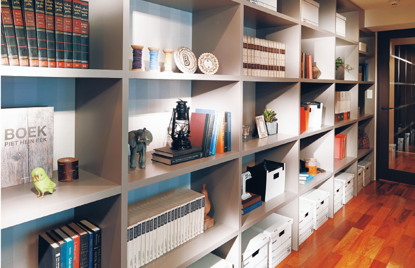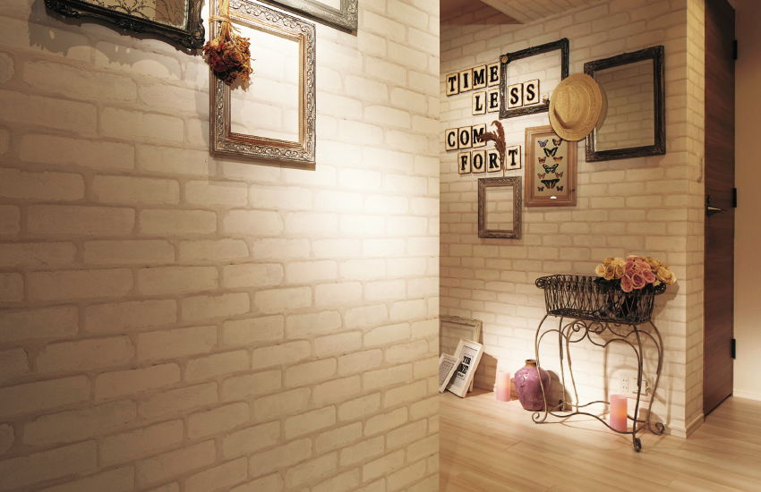 玄関を入ったとたん、たくさんの蔵書や思い出の刻まれた品々で出迎えてくれるよう、廊下一面を本棚に。突き板のフローリングに、ヴィンテージウッド風のクロスを施し、アンティーク調の雰囲気を演出。ラウンドウィンドウが明るく開放的でありながら、落ち着きあるゆったりとした時の流れを演出します。