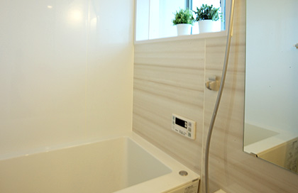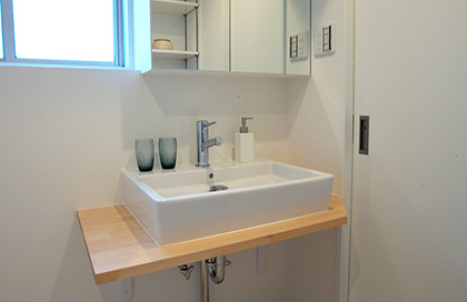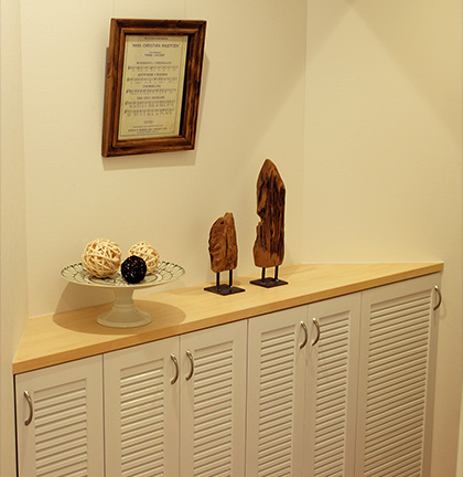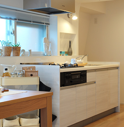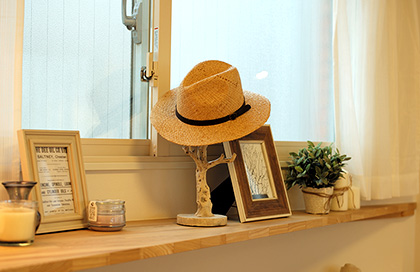 玄関・キッチン窓・浴室窓・洋室カウンター... 随所に「飾れる」ポイントを用意しました。特別にオーダーした、白い塗装のルーバー間仕切りが、部屋全体を柔らかにまとめ上げています。