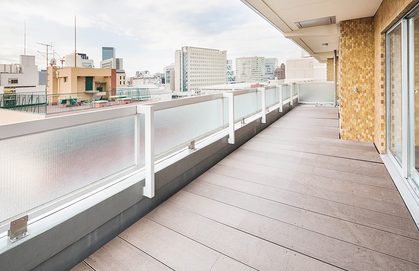 青山の市街を望むバルコニーにはウッドデッキを施工。十分な広さでアウトドアリビングとしても機能します。