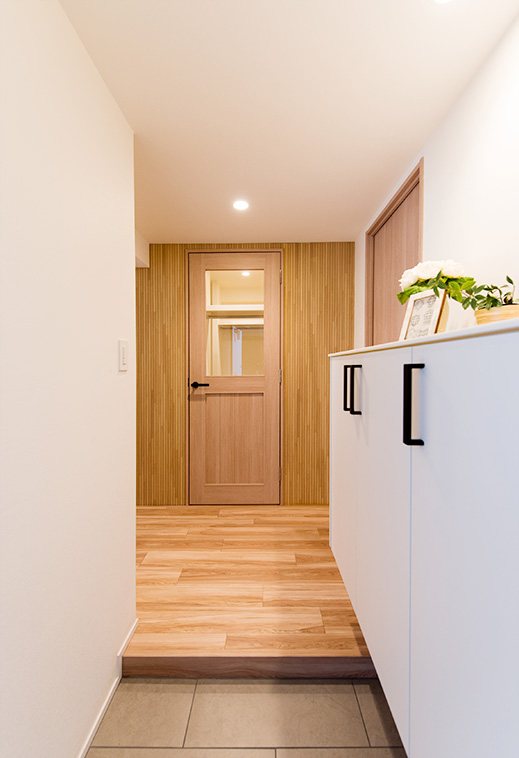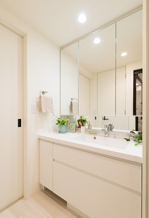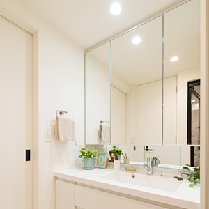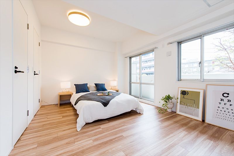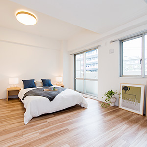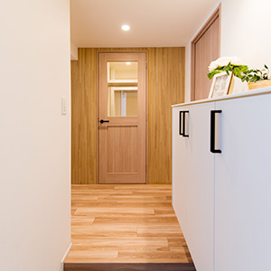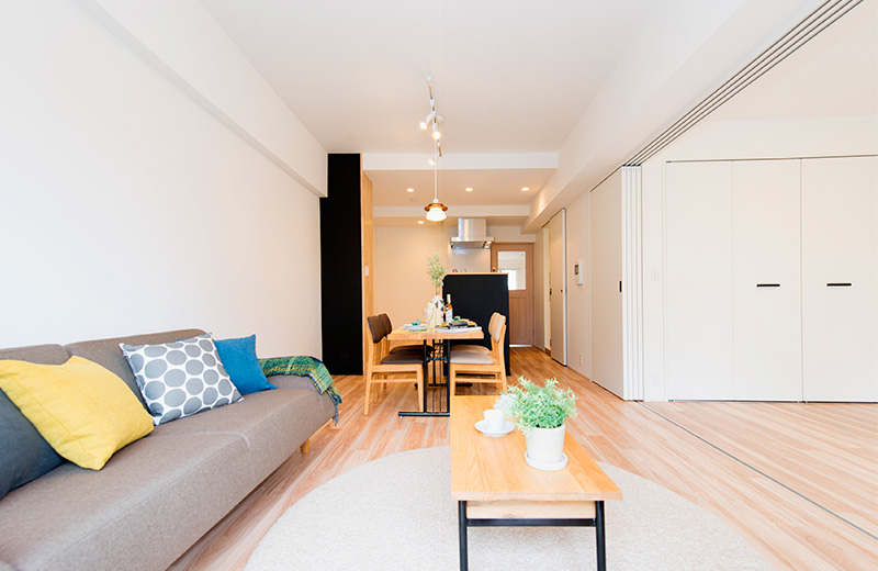 | リフォーム箇所 | 全室フローリング張替、全室壁天井クロス張替、キッチン新調、洗面化粧台新調、ユニットバス新調、トイレ新調、建具新調、収納新調、エアコン新調、洗濯パン新調、スイッチ・コンセント新調、ダウンライト新調、カーテンボックス新調、カーテンレール新調 |