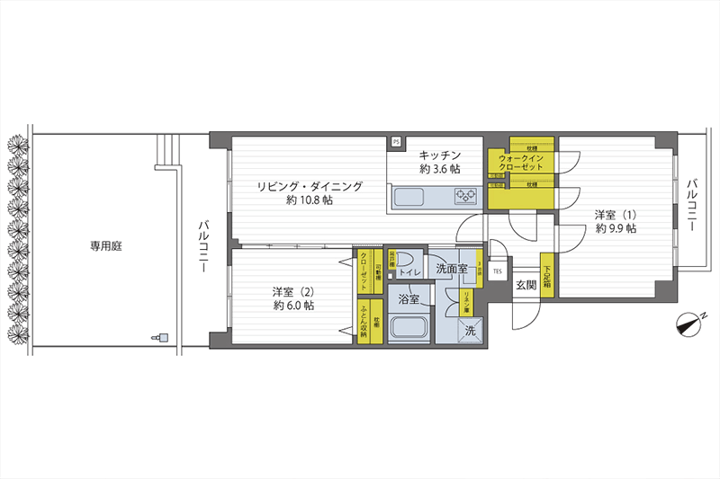 | バルコニー面積 ・ 向き | 11.25m² (南向き) 専用庭20m²(使用料:月額800円) |