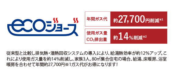 試算条件:※1,2ガス使用量は季節に応じて変化するため、家庭用の平均的な月別使用量比率に従って年間ガス使用量を各月に割り付けたうえで試算(東京ガス)。居間の暖房はガス温水床暖房と電気エアコンを併用、居間以外の暖房及び冷房は電気エアコン使用、浴室暖房乾燥機使⽤(⾐類乾燥週2回/年、浴室乾燥週7回/冬期)。ガス料金は2022年9月実施の約款の料金表且つ2022年12月時点の原料費調整額を適用。料金表が変更になる可能性がありますので、詳細はお問い合わせください。機器の運転状況等により削減額・量は異なります。※2機器の運転状況により熱源機の熱効率は変動するため、熱効率を一定に固定したうえで試算。CO₂排出係数はガス2.29kg-CO₂/㎥(東京ガスデータ)※東京ガス㈱が試算したものであり、一定の削減金額を保証するものではありません。※エコジョーズ(家庭用ガス温水床暖房契約セット割(東京地区等))とスタンダード給湯器(従来型)(家庭用ガス温水床暖房契約バス暖割(東京地区等)ガス代約181,800円/年、(ガス使用量968㎥/年))との比較 ※「エコジョーズ」は登録商標です。
