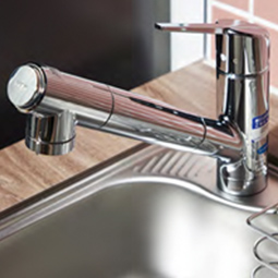 手元で水の出し止めができ、またスライドバーで高さを調節できます。