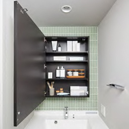 鏡裏はすべて収納スペース。ドライヤー置場も用意しました。