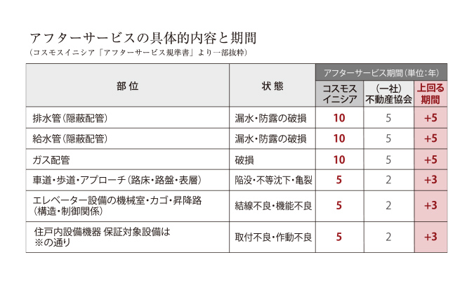 コスモスイニシアでは、独自の「アフターサービス規準書」において、(一社)不動産協会が定める規準を上回るアフターサービス期間を設定。より長い期間にわたる安心をお届けしています。