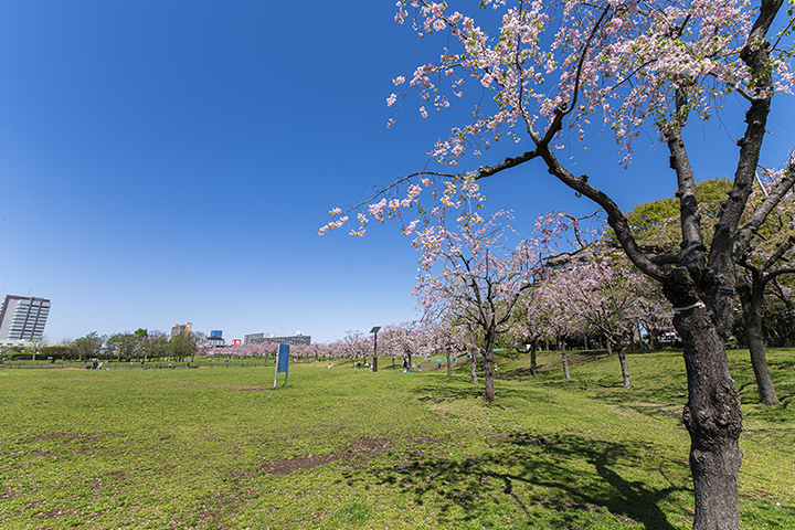 広い芝生広場やじゃぶじゃぶ池もあり、春には見事なシダレザクラが咲き誇る。