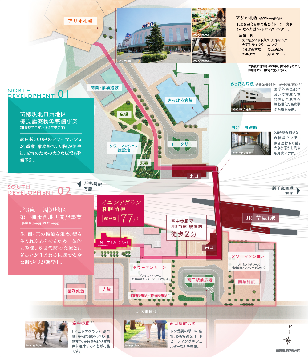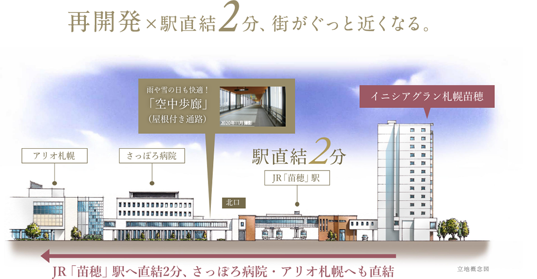 空中歩廊により「イニシアグラン札幌苗穂」から北口の「アリオ札幌」まで結ばれ、天候に左右されず往来でき、利便性が大幅にアップ。住環境、商業活動、交通利便性、コミュニティの強化といった多方面で地域の魅力を高めています。新しい駅舎とともに進むこの再開発は、苗穂地区をより魅力的で住みやすいエリアへと変貌させています。