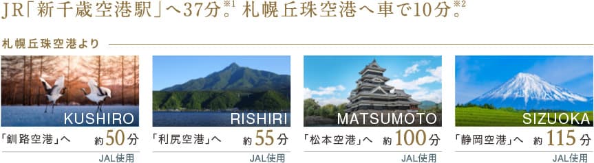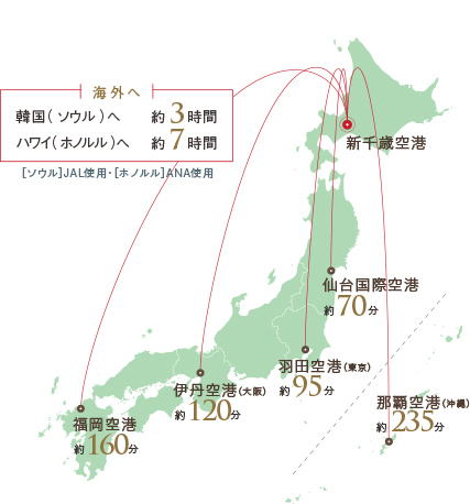 ※1.[JR「新千歳空港」駅)へ]JR千歳線「苗穂」駅より37分:JR千歳線・苫小牧行利用。「新札幌」駅よりJR快速エアポート124号利用。)