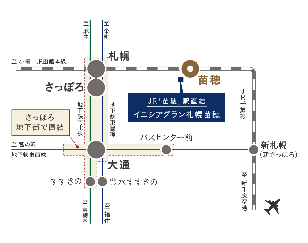 JR千歳線「苗穂」駅より/日中平常時:JR函館本線・小樽行利用、「札幌」駅より徒歩利用。「さっぽろ」駅より札幌市営南北線利用(乗車時間によって所要時間が13分~20分となります。)通勤時:JR千歳線・札幌行利用。「札幌」駅より徒歩利用。「さっぽろ」駅より札幌市営南北線・真駒内行利用(乗車時間によって所要時間が13分~19分となります。)