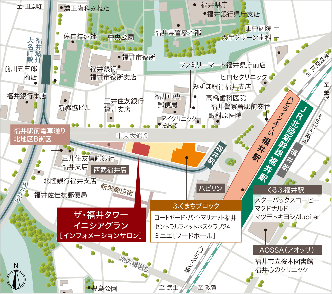 | 交通 | 北陸線「福井」駅西口徒歩4分 勝山線「福井」駅徒歩5分 福鉄線「福井駅前」駅徒歩3分 |