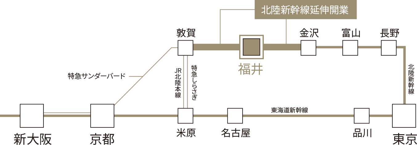 J R 北陸本線「福井」駅は 2024年3月、北陸新幹線の延伸開業により首都圏・信越圏と直結。ビジネスや観光のいっそうの発展が期待されています。