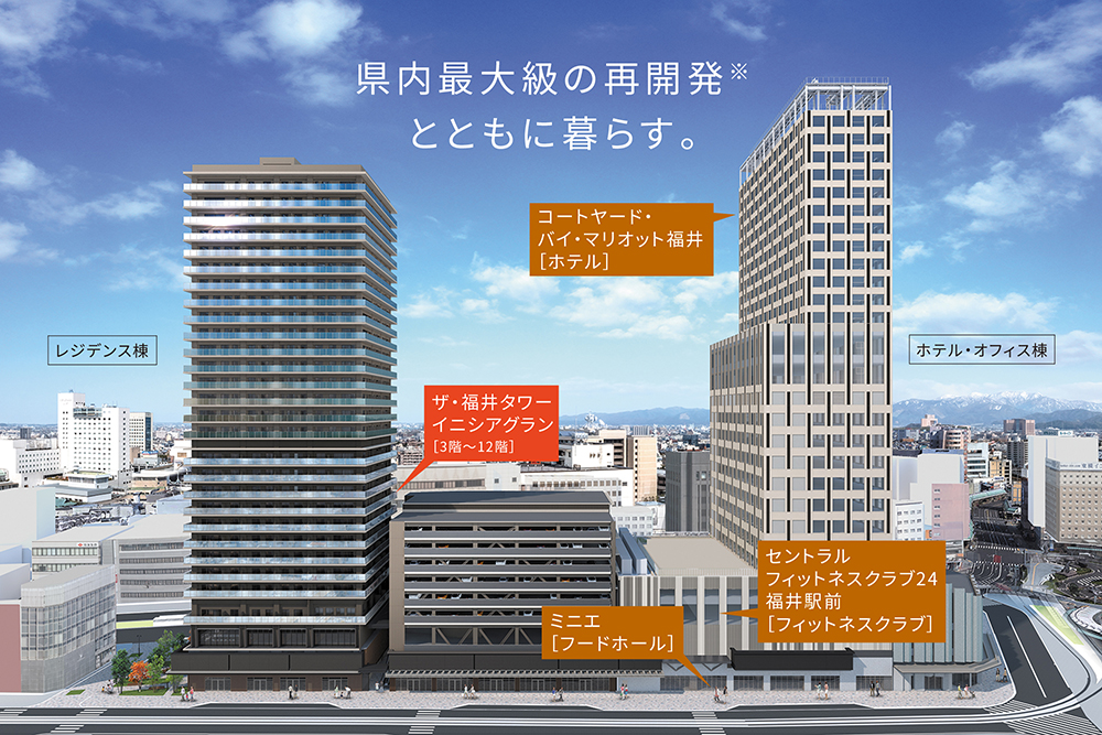 | 敷地面積 | 6,946.12㎡ (福井駅前電車通り北地区A街区全体)掲載の敷地面積は建築確認対象面積であり、 分譲対象面積は隣地越境物の存する面積4.91㎡を除いた6951.03㎡となります |