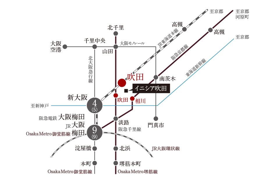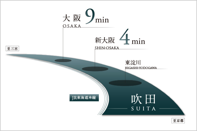 JR東海道本線「吹田」駅から直結の「大阪」駅は私鉄・地下鉄各駅への乗り換えがスムーズ。また「新大阪」駅へもダイレクトで新幹線利用も快適です。