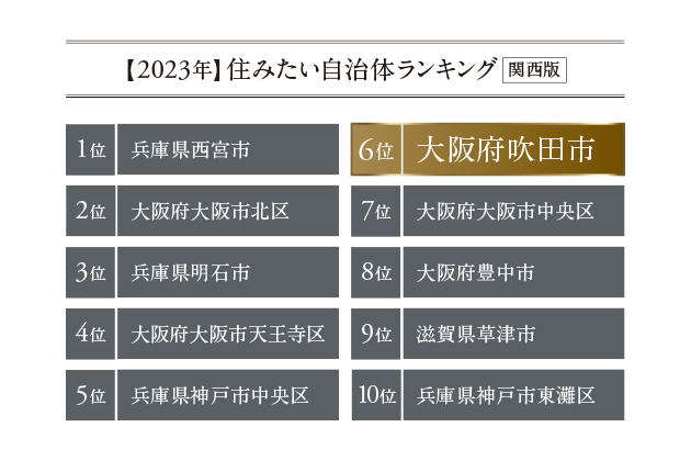 関西居住者を対象に調査された「住みたい自治体ランキング2023 関西版」において、吹田市は数ある自治体の中で第6位と、上位に輝いています。