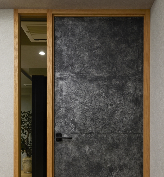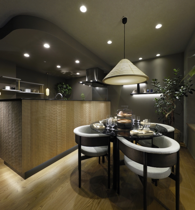 キッチンの腰壁には独特の陰影が風情を感じさせる京名栗を。