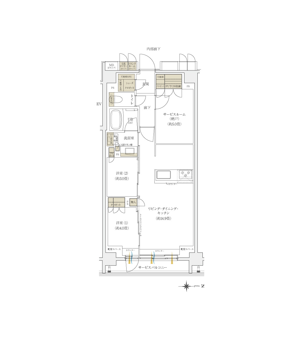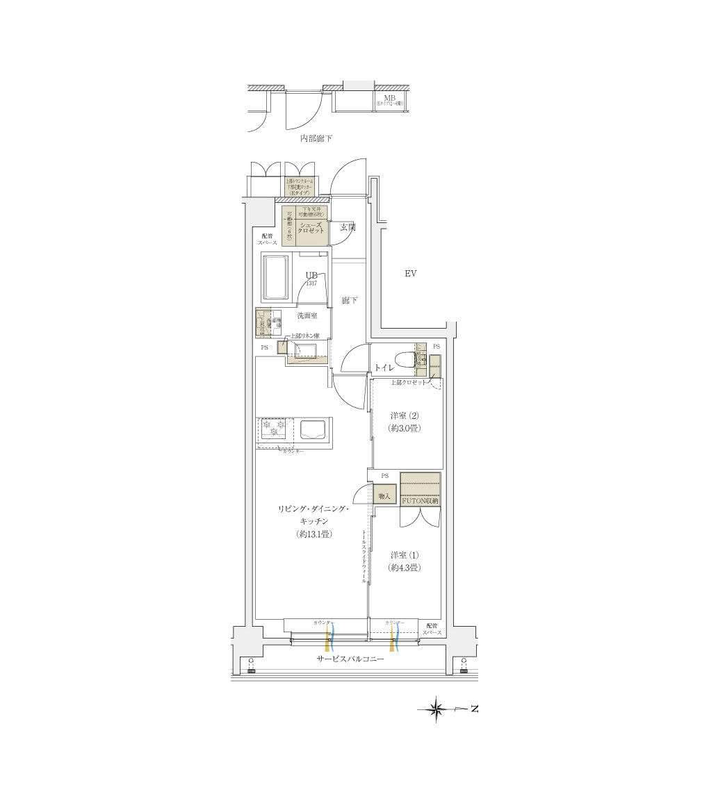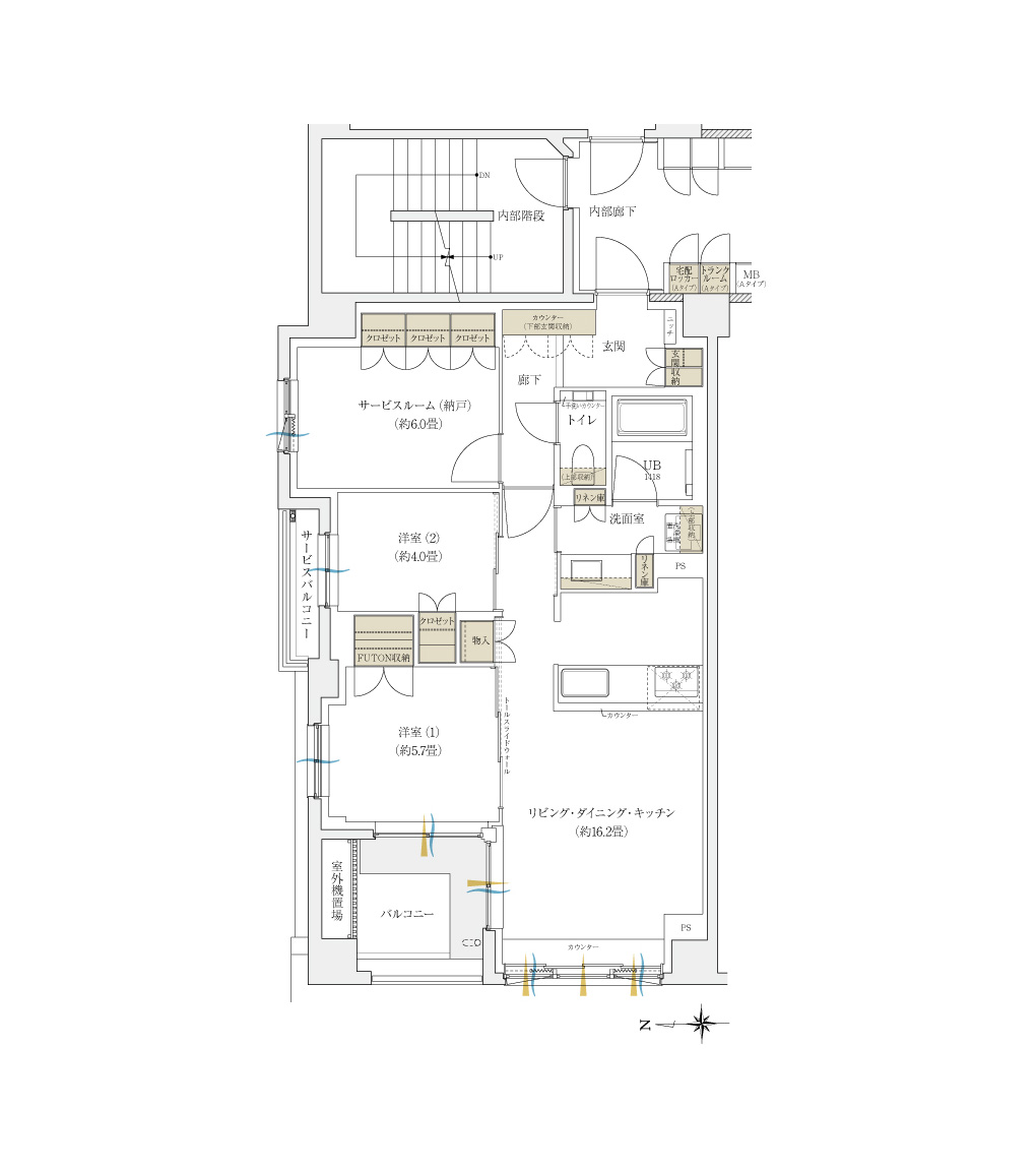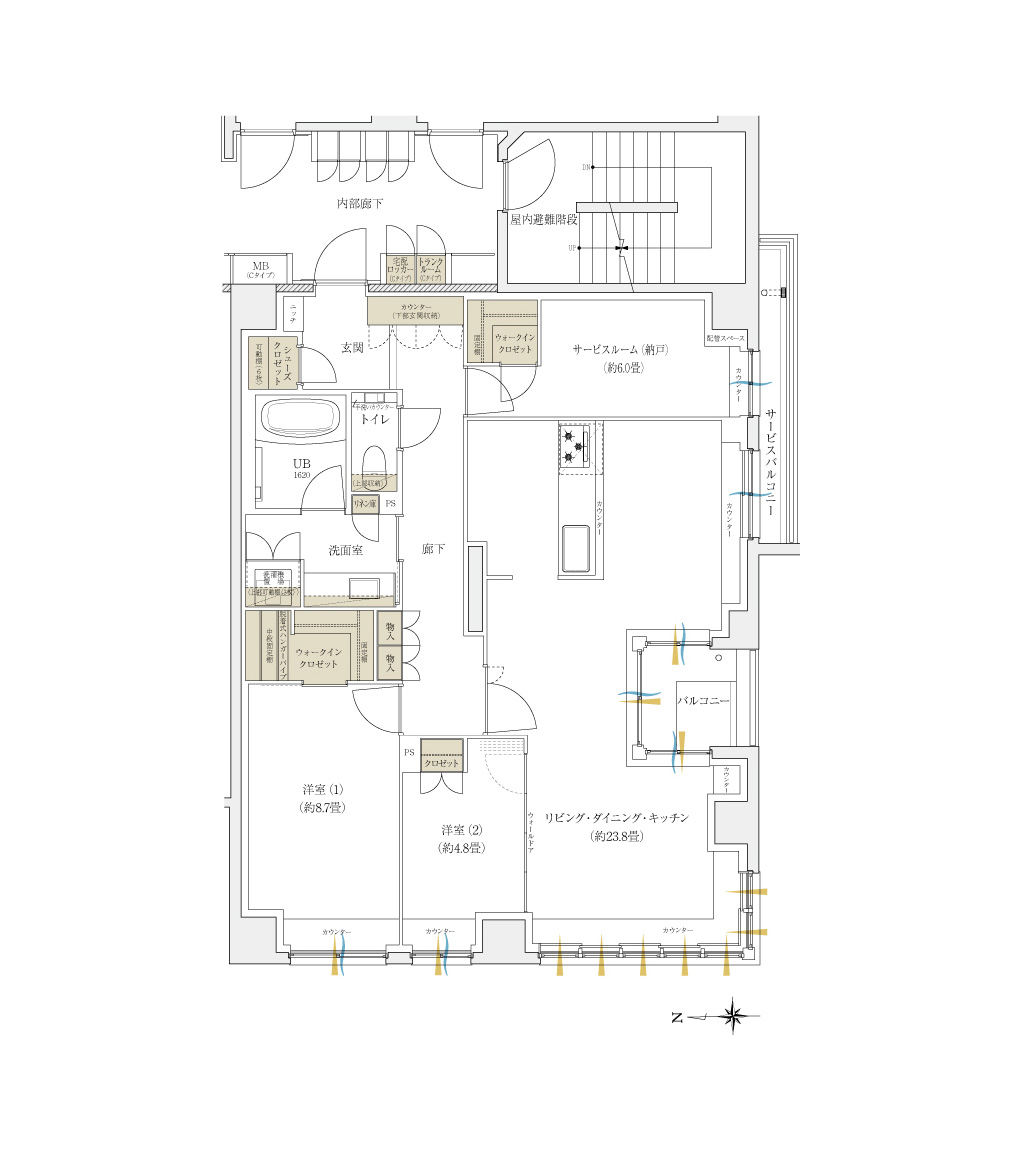 小上がりとは部屋の一角に設けられた一段上がったスペースのこと。本件では、ゆったり腰かけて外界の景色を眺められるよう御幸町通に面するリビングの窓辺に高さ約60cm・奥行約40cmの小上がりを設けたプランもご用意(西向き住戸)。