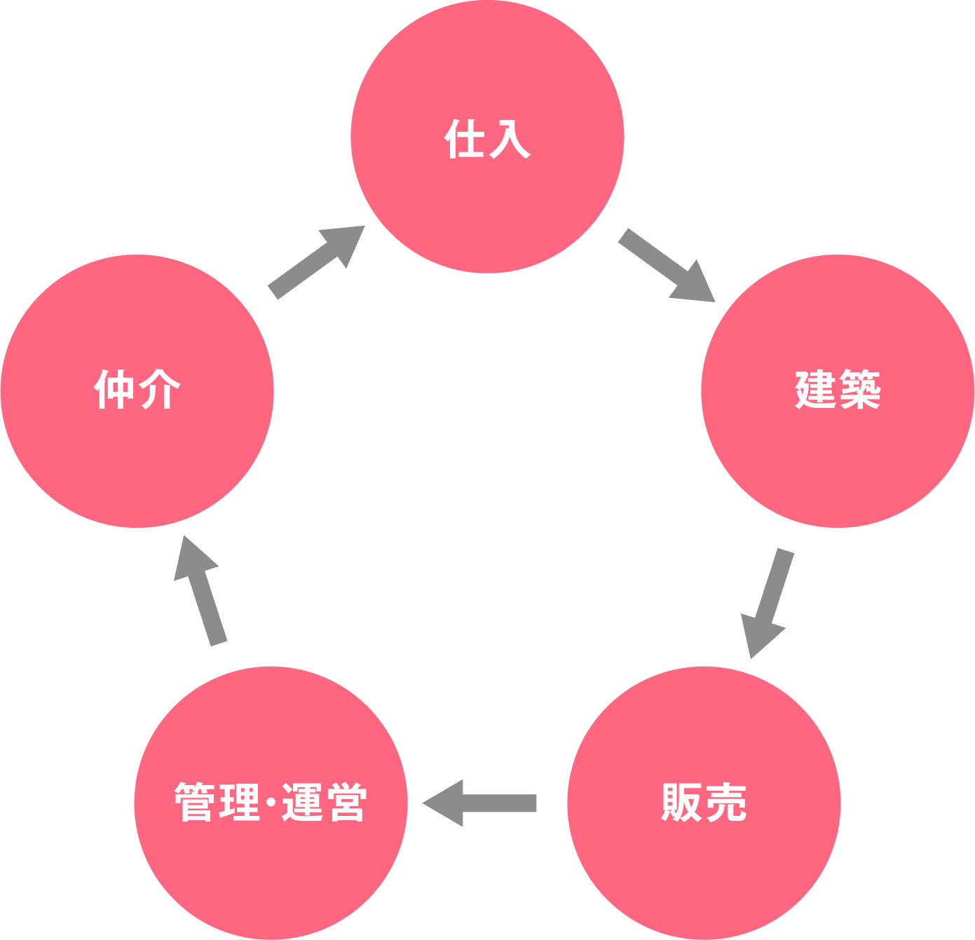 ひとくちに不動産事業会社と言っても、さまざまな役割・機能・事業があります。コスモスイニシアでは、土地・建物の仕入れからものづくり、販売、その後のアフターサービスまで、製販一体となっています。さらに、お客さまの幅広いニーズに応えるため、たくさんの機能を内包し、住宅に限らず収益不動産(オフィスビル・商業ビル・ホテル)も取り扱っています。